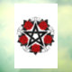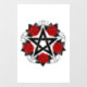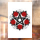 Black pentagram with pattern, decorated with blooming, red roses with leaves on white background. Tattoo style.