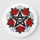 Black pentagram with pattern, decorated with blooming, red roses with leaves on white background. Tattoo style.