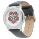 Black pentagram with pattern, decorated with blooming, red roses with leaves on white background. Tattoo style.
