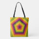 This image is an abstract geometric design featuring concentric pentagons in vibrant, alternating colours. The pentagons are nested inside one another, creating a tunnel-like, hypnotic effect that draws the eye towards the centre. The colour palette includes bold shades like magenta, orange, yellow, olive green, and dark purple, giving the overall look a retro, psychedelic vibe.