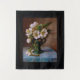 This is a simple and beautiful still life painting of white Tree Peonies (which are a woody Perennial Shrub that blooms in early spring); that have been places in a glazed ceramic emerald green and cobalt blue vase with a handle...