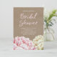 Peonies bridal shower invitations featuring photo of kraft paper, pretty floral illustration of watercolor flowers and gold look dots, on pink watercolor background, at the back. Easily personalise chic bridal shower invites with your party details, favourite colours and fonts.