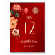 This colourful Chinese wedding table number card features red, orange, yellow Chinese flowers on a shimmering red background. Matching Chinese wedding invitation available.