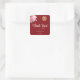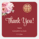 Chinese wedding thank you sticker with a gold double happiness symbol and pink peonies on a maroon red background.