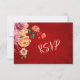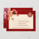Red, orange and neutral tones peony flowers on a shimmering red background and a gold double happiness symbol. RSVP Chinese Wedding Card.