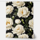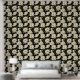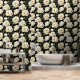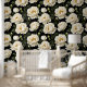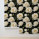 A beautiful seamless repeating pattern of wall to wall off-white peo peony flowers with mustard gold stamens in full bloom set against a black background that has small green leaves and peony buds around the blossom. This bold and elegant country meadow inspired design has a timeless and elegant summer / spring feel to it. Transform any room into a stately and majestic masterpiece with this design suited to any large space whether it be a living room; bathroom or bedroom. Ideal for country manors, English and French cottages, homes and business environments.