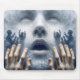 Pair of hands and face pressed on wet glass with silhouette of a distressed crowd of people reaching out