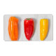 Peppers of different colour placed on a grey cutting board
