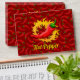 Red chilli pepper with circle of flame on removable seamless pattern background. Custom text.