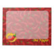 Red chilli pepper with circle of flame on removable seamless pattern background. Custom text.