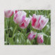 Image of pink and white striped Dutch tulips with green stems and leaves in a garden.