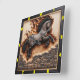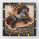 Introducing a stunning clock that captures the spirit of strength and beauty, featuring a magnificent Andalusian horse leaping over a weathered stone wall, set against a dramatic backdrop of flames. This unique timepiece is framed by a sleek ½-inch flat black wooden border, which enhances its striking visual appeal. The embedded wood showcases intricate carvings with a charred, textured grain, highlighted by rugged burn marks in shades of red, grey, and black, creating a captivating contrast with the lighter wood. This clock is not just a functional item; it is a work of art that brings a sense of dynamism and elegance to any space.