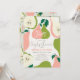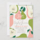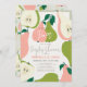 This cute and modern "a little cutie is on the way" couples/bridal shower/engagement party invitation card features pink and green pears and pear slices on a cream background framed by a light green border. The reverse side features a light green background with pear patterns. Personalise it for your needs. You can find matching products at my store.