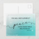 This calming Christian postcard features Isaiah 26:3: “You will keep in perfect peace those whose minds are steadfast.” The word “peace” is highlighted in graceful script over a peaceful teal-blue watercolor background, offering reassurance and clarity. A gentle and uplifting design ideal for sending encouragement, meditating on scripture, or displaying as a gentle reminder of God’s peace.