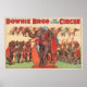 Vintage Downie Brothers circus poster showing performing elephants with women and trainer hanging by head from elephant's mouth.