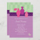 Chic invitation perfect for a sophisticated bride. Pink perfume bottles on a purple and stripe green background add a vintage french touch to this design.