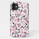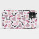 An iPhone 5 case featuring a design consisting of pink and black retro cat eye sunglasses, pink change purses with grey polka dots, pink clutch purses with black bow, pink lipsticks, pink gemstones, and bottle of perfume with pink atomizer.