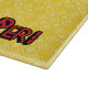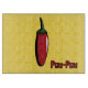 A red peri-peri chilli pepper, also known as piri-piri or pili-pili, is decorated with patterns inspired by the traditional sarong capulana from Mozambique and sits on a yellow background with a smaller version of the same pattern and a script label in the corner. This spicy, red pepper was originally cultivated in Mozambique after pepper plants were brought by Portuguese explorers.