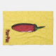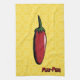 A red peri-peri chilli pepper, also known as piri-piri or pili-pili, is decorated with patterns inspired by the traditional sarong capulana from Mozambique and sits on a yellow background with a smaller version of the same pattern and a script label in the corner. This spicy, red pepper was originally cultivated in Mozambique after pepper plants were brought by Portuguese explorers.