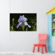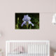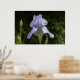 Pretty periwinkle iris with white centre and yellow beard and buds ready to open in the background. Raindrops on delicate petals. Green shrubs are blurred in the distance. Original Photography © TamiraZDesigns.