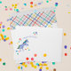 A prancing pale periwinkle blue unicorn with rainbow mane and tail decorates this magically sweet envelope with a custom pre-printed return address and colourful hearts making it the perfect addition to birthday party invitations or to create a custom set of children't personal stationery.