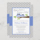 Modern periwinkle owl themed baby shower invitations. Design features a mother and baby owl sitting on a branch with a grey chevron pattern.