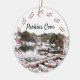 Watercolor of boats in Perkins Cove of Ogunquit, Maine. One side says Perkins Cove and the other says Ogunquit. The wreath around the picture is made of holly sprigs.