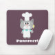 Cute Chef kitten with the word "Perrfect!" over an eggplant purple background colour.