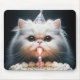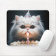 A fluffy white Persian cat wearing a birthday hat with a pink tongue ready to lick cake frosting