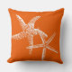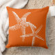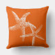 Persimmon orange square, throw pillow with two starfish in white outline. Coastal home decor accent.