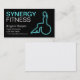 Outline of a woman working out with a physio-ball in a glowing blue colour with a solid black background. Text is in a matching colour and with a modern, crisp font. Great looking high energy business card for a Yoga, Physioball, Aerobics, Pilates, Personal trainer or anyone in the fitness industry.