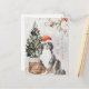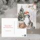 Holiday postcard featuring a charming watercolor illustration of a Bernese Mountain Dog in it's Santa's hat standing next to a Christmas tree with red and gold ornaments, winter florals and holiday greenery in the upper right corner all set in a grey toned background with falling snow. Happy Holidays text on front of card. Holiday Greetings and Best Wishes for a Healthy and Happy New Year text shown on the reverse with a signature line. All text can be customised to your preference or removed altogether.