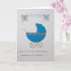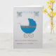 Personalise, Hand-cut blue baby stroller with gold painted for the birth or baby shower of a baby boy on greeting card.