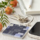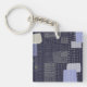 Dark blue keychain with traditional japanese sashiko printed design that resembles stiches and patches and custom name.