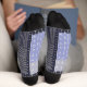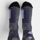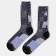 Dark blue socks with traditional japanese sashiko printed design that resembles stiches and patches and custom name.