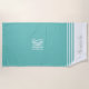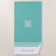 Personalise this Cool and trendy teal beach towel with your Name and Monogram with white and grey text and white horizontal lines. Makes a great gift for her or him, boy or girl.