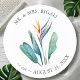 Elevate your wedding favours with these personalised wedding coasters, featuring a stunning watercolor bird of paradise flower paired with lush palm leaf foliage in vibrant shades of orange, turquoise, and green. Designed by Victoria Grigaliunas of Do Tell A Belle, these coasters blend elegance and functionality, making them ideal custom wedding drink coasters and thoughtful tropical gifts for your guests.