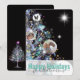 Original graphic design winter tree with glowing orbs of light and start on a black background. Add three family photos that look like christmas ornaments. Optional space for a message from you on the back. Stylish elegant christmas tree photo card in teal, pink, silver and white.