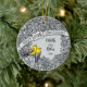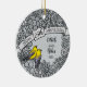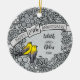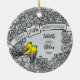 Here is a whimsical intricate floral themed 25th wedding anniversary ornament that you can personalise for a special bride and groom! Two prothonotary warblers perch on a decorative floral pattern border made of silver coloured flowers and artistic swirls. The birds sit beside a space for two names and a wedding year in script text.