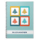 A graphic illustration of 4 christmas trees, tiled in a poster style. Retro colours - yellow. orange, blue and green. Cute and festive. Personalise with a name.