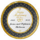 A lovely crinkled gold-tone ring borders both sides of a beautiful black and silver damask pattern. This elegant Porcelain Anniversary Plate features the names of the anniversary couple as well as the years of their marriage and anniversary - flanked by hearts of the same crinkled gold-tones. An elegant piece that is surely to be the most unique and thoughtful wedding anniversary gift they receive! All you have to do is fill in the blanks with the appropriate information.