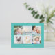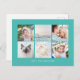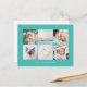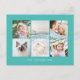 Personalised 6 family photos professional turquoise blue Universal Greetings Postcards featuring a stylish photo collage with 6 customised images, your greetings message in elegant handwritten script font, your name, date, year, message on the back in a modern and simple sans serif font.