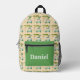 This fun personalised backpack, featuring a playful golf pattern with golf carts, golf shoes, golf clubs and balls and a golf putting green with bunker.