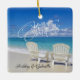 A beach scene with two Adirondack chairs in the sand with the ocean waves crashing up. "Merry Christmas" is in a fancy script. Personalise by adding your names.