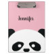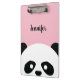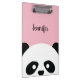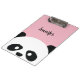 Personalised Adorable Panda Bear Pink Pattern Kids Clipboard. Light pink background with black and white panda bear peeking out from bottom. Personalise with name. Customise to change background colour or font. Back side is panda face pattern. www.SamAnnDesigns.com