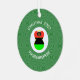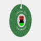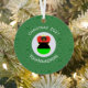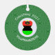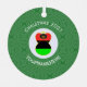 The red, black, and green African American Flag is worn by this angel for Christmas decor on a metal ornament She flies in a white circle of squiggly squares surrounded by a background of green squiggly squares. Above the circle reads CHRISTMAS 202?. You can customise by adding the year or replace with your text. Below, is a place for a name, yours or personalise for a gift.