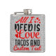 Personalised All I Need Love Tacos and Custom TEXT Hip Flask