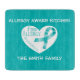 Allergy aware kitchen cutting board with teal ribbon. Personalise with family name or individual name. Perfect for allergen friendly kitchens. Designs by Lil Allergy Advocates www.lilallergyadvocates.com