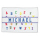Kids Personalised Alphabet design features a white background to the alphabet in bright, colourful stencil lettering. Child's name is displayed across in blue. Also available in red. Designed to coordinate with the "ABC Baby Shower and Nursery Collection."