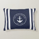 Nautical home decor in navy blue and white with anchor and stripes, personalised with a family name and year. This coastal style accent pillow is a part of the living room decor collection.